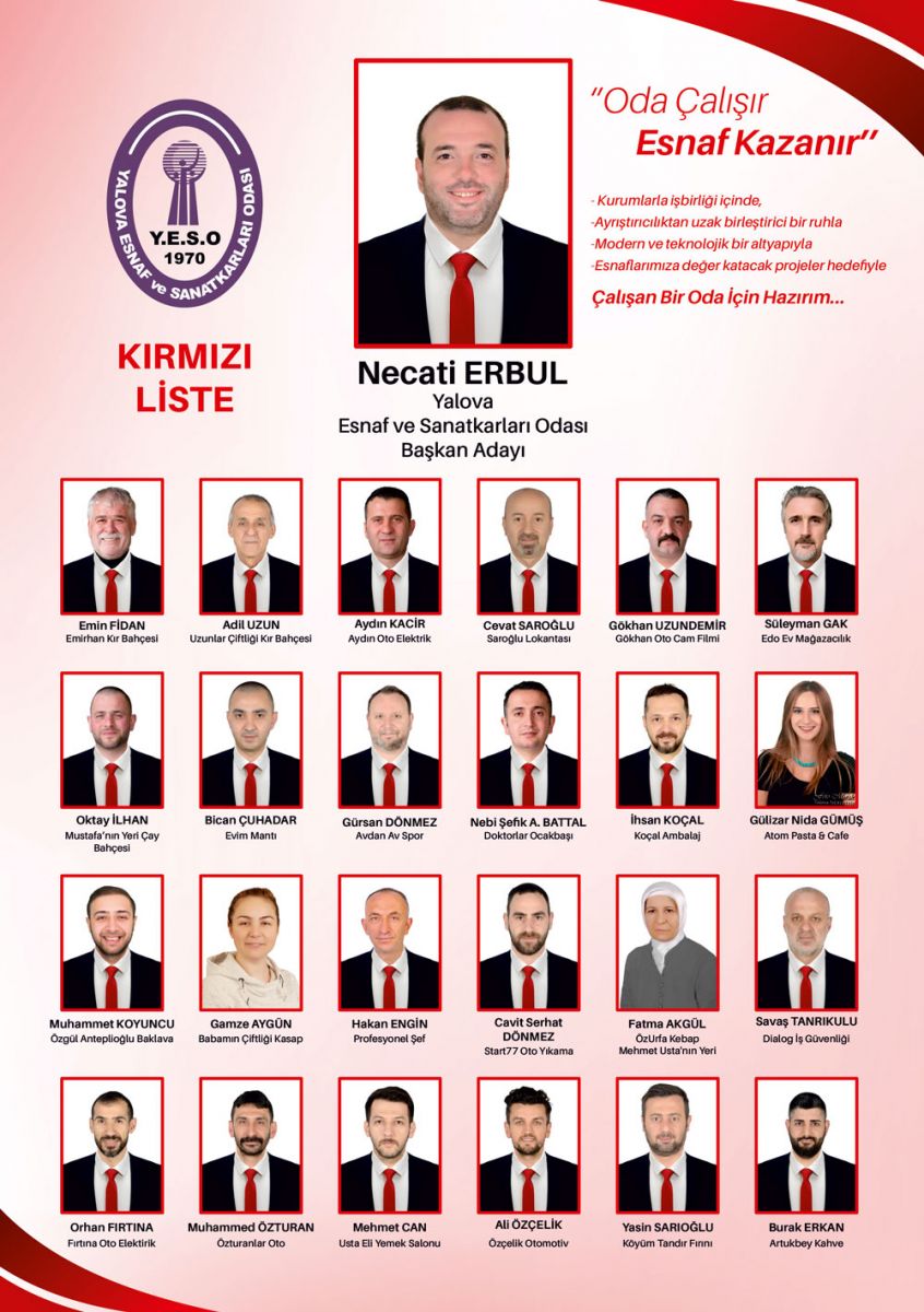 Çalışan bir Oda ile esnafın sorunlarını gidereceklerine inandıklarını, bunun için çalışacaklarına vurgu yapan Necati Erbul, projeleri konusunda şu açıklamalarda bulundu: “Odalar çalıştıkça esnafımız kazanır. Bunun için genç, dinamik ve sorunları bilen bir yönetim ile Yalova Esnaf ve Sanatkârlar Odası’nın yönetimine talibiz. Göreve geldiğimizde; kurumlarla işbirliği içinde, ayrıştırıcılıktan uzak birleştirici bir ruhla, modern ve teknolojik bir alt yapıyla, esnafımıza değer katacak projeler hedefiyle çalışan bir oda yönetimi olacağız.