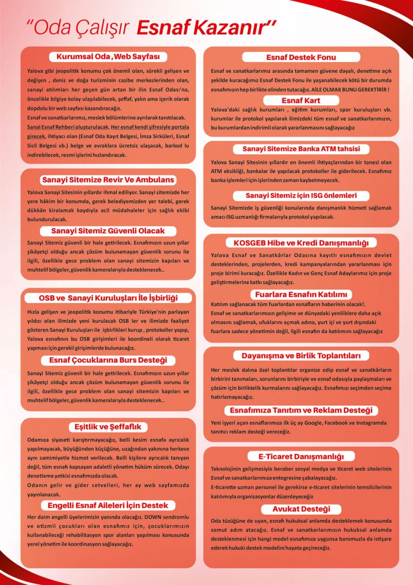 Odamıza kayıtlı tüm esnaflarımıza, üzerlerinde oda kayıt bilgisi, sicil numaraları gibi kişisel bilgilerin yazdığı, esnaf kimlik kartlarını, bizzat işyerlerine gidip dağıtacağız. Yalova’daki sağlık kurumları, eğitim kurumları, spor kuruluşları vb. kurumlar ile protokol yapılarak ilimizdeki tüm esnaf ve sanatkârımızın, bu esnaf kimlik kartları aracılığı ile bu kurumlardan indirimli olarak yararlanmasını sağlayacağız.