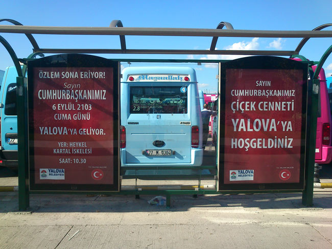 Cuma günü Yalova’da olacak Cumhurbaşkanı Abdullah Gül’ün Yalova’ya geleceğini duyuran duraklarda bulunan billboard ilanlarında Cumhurbaşkanının geleceği tarih 2013 yazılacağına 2103 olarak yazıldı.