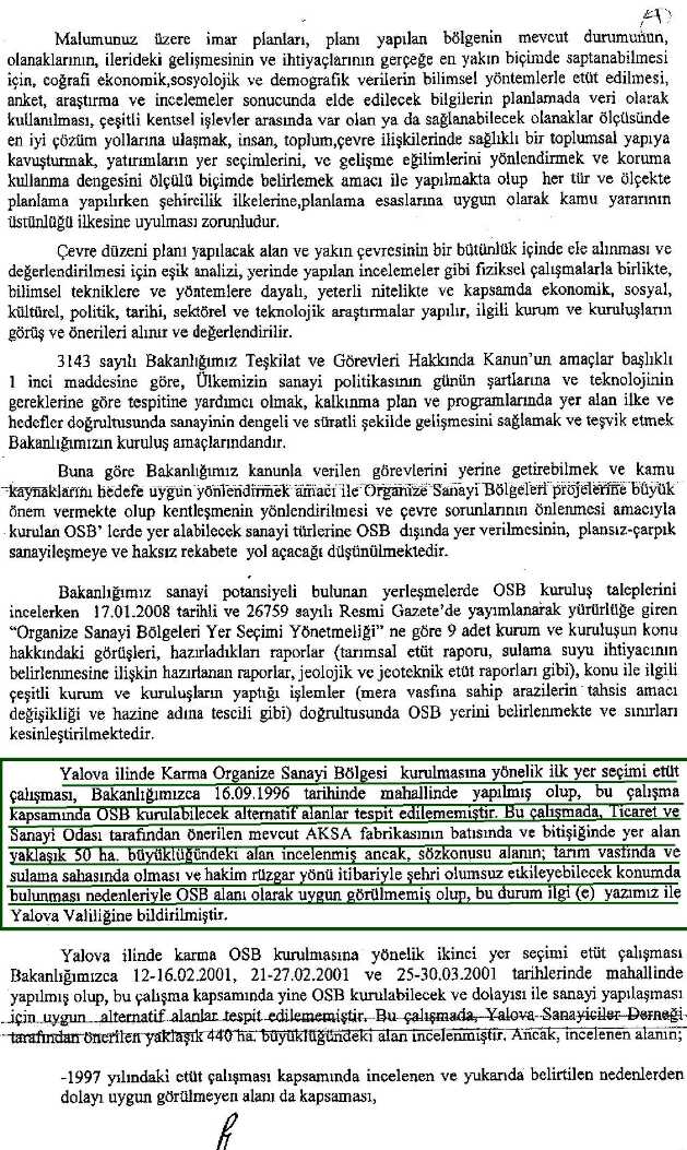 Bakanlığı sanayi alanını hakim rüzgar yönü itibarıyla şehri olumsuz etkiler diyor.Çarpık sanayileşme ve çevre sorunlarının önlenmesi, sanayinin denetime alınması için sanayiyi dolu olmayan Bursa, Bilecik, Kocaeli ve Sakarya İllerinde bulunan OSB lere yönlendirin diyor. Yalova’da yeni sanayi alanı istemiyor. İtiraz ediyor Ve 1/25000 ölçekli imar planlarında mevcut sanayi hariç, yeni sanayi alanlarını mahkeme kararı ile 2009 yılında iptal ettiriyor.
