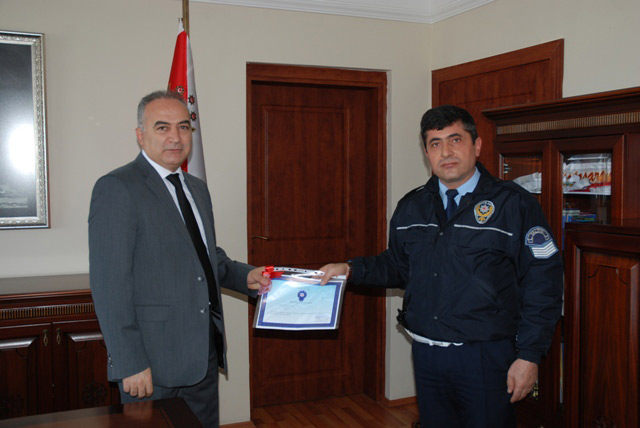Yalı Caddesi üzerinde rahatsızlanarak yere yığılan 70-80 yaşlarındaki yaşlı bir kadının yardımına koşarak üşümemesi için üzerindeki montunu giydiren Trafik Denetleme Şube Müdürlüğünde görevli Polis Memuru Murat TUNCER'e göstermiş olduğu örnek davranışından dolayı İl Emniyet Müdürü Sayın Hüseyin Ümit YÜKSEL tarafından belgeleri ve hediyeleri verildi.