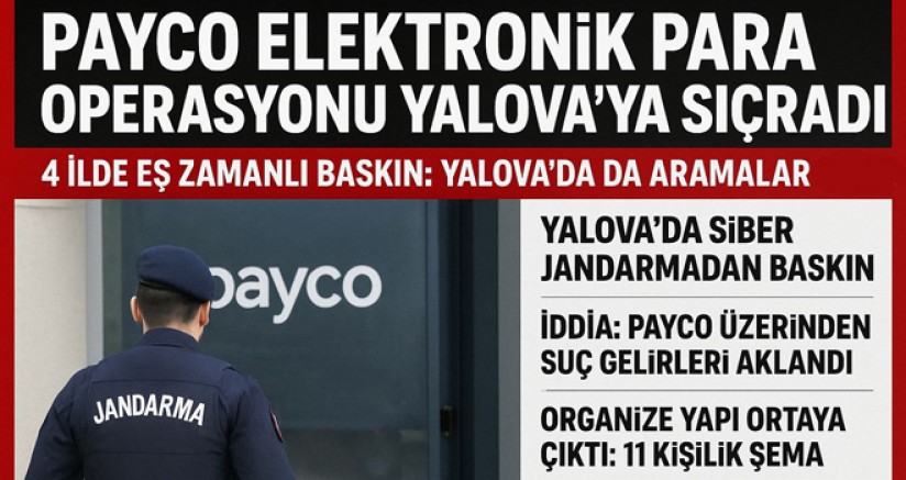 Payco Elektronik Para ve Ödeme Hizmetleri A.Ş.’ye yönelik operasyon, Yalova’nın da aralarında bulunduğu dört ilde eş zamanlı olarak gerçekleştirildi. Yalova’da belirlenen adreslerde jandarma ekiplerince aramalar yapılırken, şirketle bağlantılı olduğu değerlendirilen dijital materyal ve belgelere el konuldu.