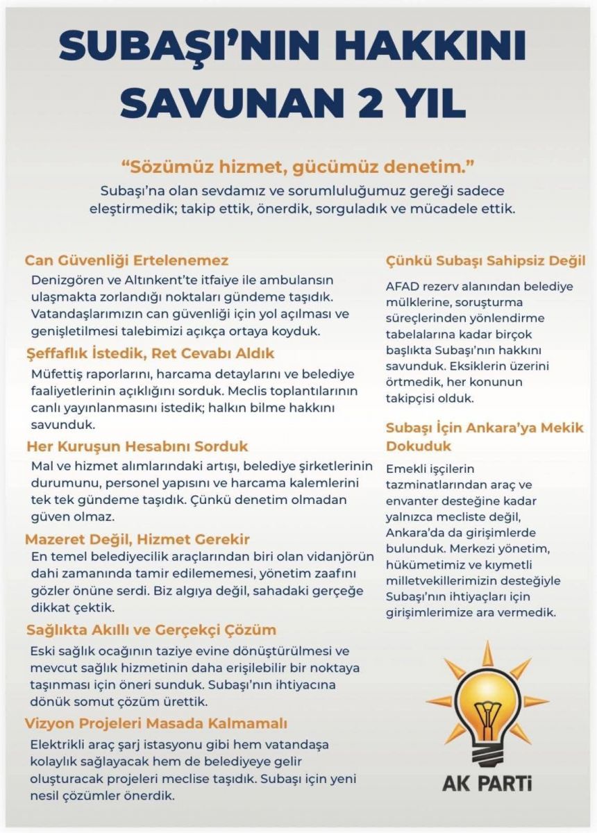 31 Mart 2024 yerel seçimlerinin ardından kendilerine verilen muhalefet görevini yerine getirmeye çalıştıklarını belirten Balkaya, Subaşı’nda gözle görülür hizmet üretilmediğini savundu. Belediye yönetiminin algı çalışmalarıyla kamuoyunu yanılttığını öne süren Balkaya, devlet projelerinin belediye projesi gibi lanse edildiğini ifade etti.