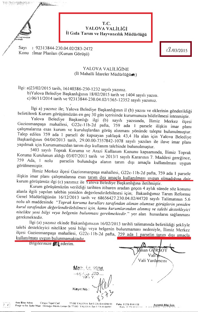 Yalova Belediye Başkanlığının talebi doğrultusunda yaşanan gelişmeye Tarım il Müdürlüğü 25.06.2015 tarihinde Toprak Koruma Kurulu'nun kararıyla birlikte cevap verdi.
