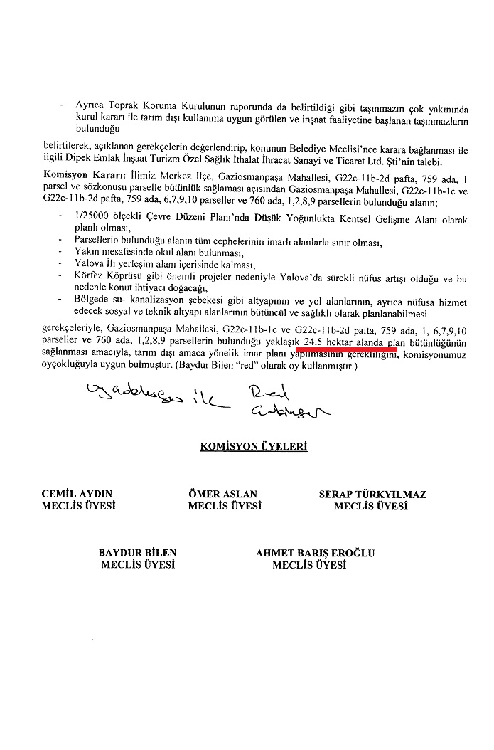 1/1000 ölçekli uygulama imar planında' tarımsal niteliği korunacak alan olan arazi için İl Toprak Koruma Kurulu, Ziraat Mühendisleri Oda Temsilcisi Dr. Emin Ergun, Tema Temsilcisi Faruk Tezcan, Çevre ve Şehircilik Müdür Yardımcısı Tayfur Kutlay'ın muhalif oylarına karşı kamu yararı kararı alınması koşuluyla tarım dışı kentsel alan kullanımına açılmasını istiyor.