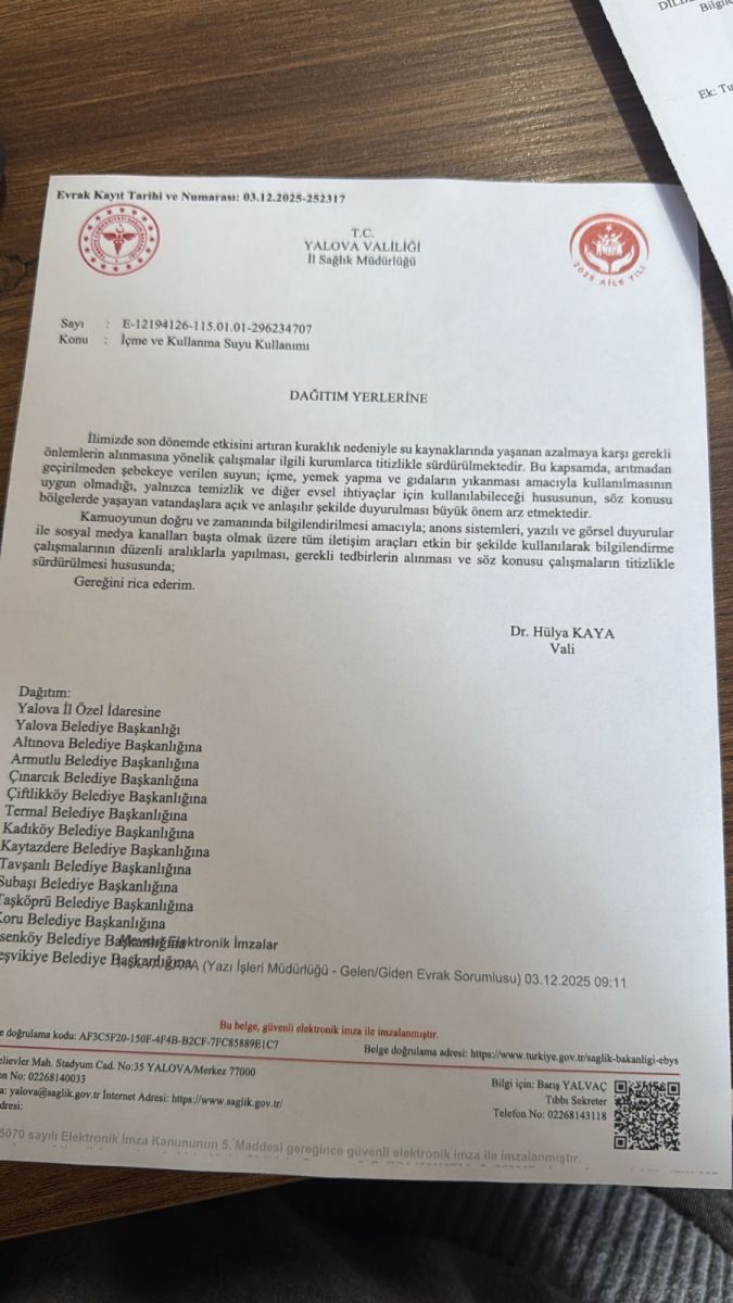Su kaynaklarındaki hızlı azalma sonrası Yalova Valisi Dr. Hülya Kaya, belediyeler ve kamu kurumlarına resmi yazı göndererek vatandaşların şebeke suyunu içmemeleri ve yemek yapımında kullanmamaları konusunda sert uyarıda bulundu.