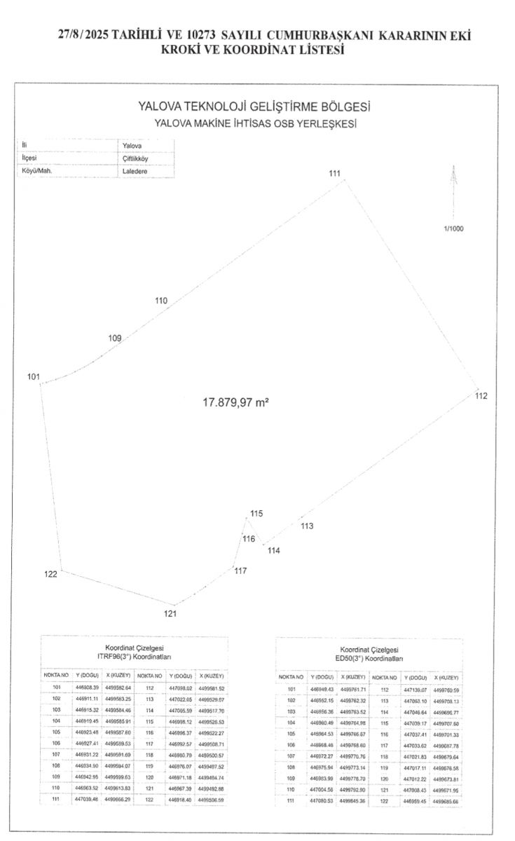 Cumhurbaşkanlığı tarafından alınan 10273 sayılı karar, 28 Ağustos 2025 tarihli ve 33000 sayılı Resmî Gazete’de yayımlanarak yürürlüğe girdi. Karara göre, Yalova Makine İhtisas OSB Yerleşkesi sınırları ekli kroki ve listeler doğrultusunda güncellendi.